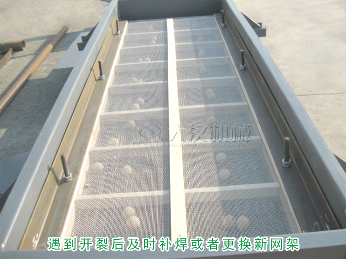 直線振動篩的篩網(wǎng)是由網(wǎng)架固定成型,所以應(yīng)該檢查網(wǎng)架是不是有變形或開裂,遇到開裂后及時補(bǔ)焊或者更換新網(wǎng)架。