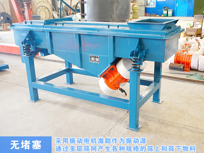 直線振動(dòng)篩采用振動(dòng)電機(jī)激勵(lì)作為振動(dòng)源,使物料在篩網(wǎng)上拋起,同時(shí)直線前進(jìn)。物料從進(jìn)料器均勻進(jìn)入篩選機(jī)進(jìn)料口,通過(guò)多層篩網(wǎng)產(chǎn)生各種規(guī)格的篩上和篩下物料,分別從各自的出口排出,不存在堵塞現(xiàn)象,產(chǎn)量高。