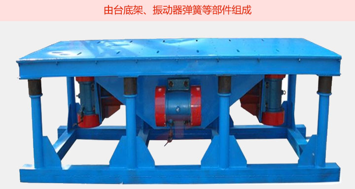 混凝土振動臺主要由臺底架、振動器彈簧等部件組成,臺面與底架均用鋼板和型鋼焊接而成,振動臺是用電動機(jī) 加一對相同的偏心輪組成。并通過一對吊架聯(lián)軸器安裝在臺面(反面)中心位置,起著振實(shí)過程中平穩(wěn)、垂直方向的作用。