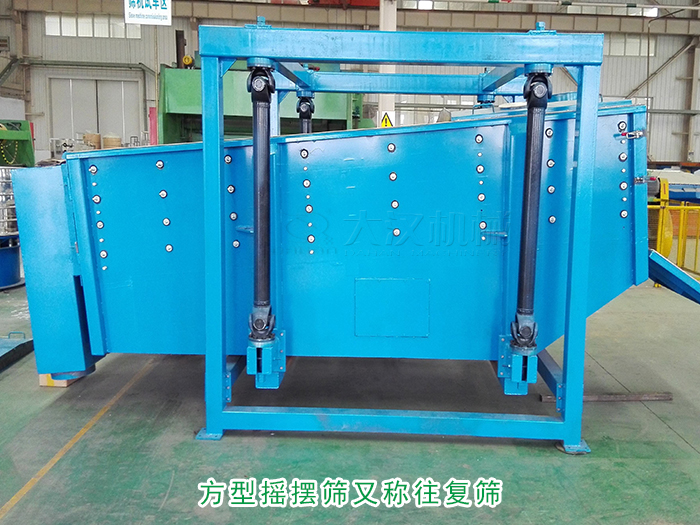 方型搖擺篩又稱往復(fù)篩,其驅(qū)動(dòng)裝置所產(chǎn)生的振動(dòng)力是一繞定軸、方向呈一定規(guī)律變化的慣性力,其本質(zhì)是由偏心輪繞定軸轉(zhuǎn)動(dòng)所形成的往復(fù)慣性力。篩機(jī)啟動(dòng)后,篩機(jī)搖動(dòng)體即篩箱在慣性力的作用下作前后往復(fù)運(yùn)動(dòng),篩箱帶動(dòng)篩面作周期性搖動(dòng),從而使篩面上的物料隨篩箱一同作定向跳躍式運(yùn)動(dòng),期間,小于篩面孔徑的物理通過篩孔落到下層,成為篩下物,大于篩面孔徑的物料經(jīng)連續(xù)翻滾跳躍運(yùn)動(dòng)后從排料口排出,完成篩分工作。