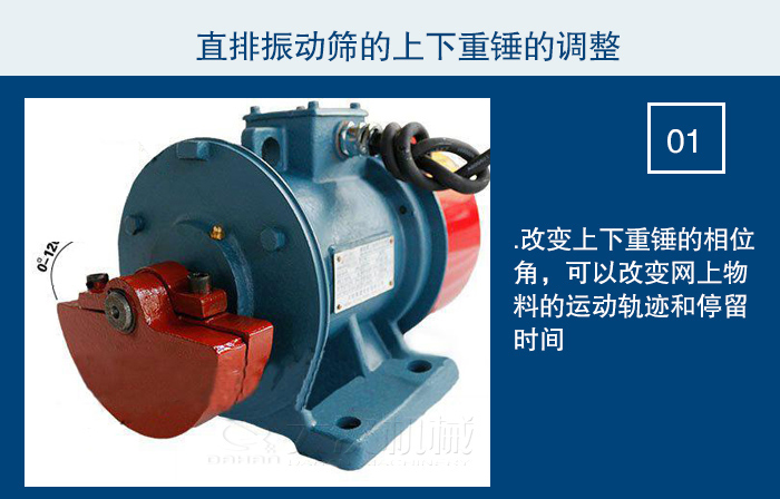 1.改變上下重錘的相位角,可以改變網(wǎng)上物料的運動軌跡和停留時間。為是篩機適應各種物料所需求的分離狀態(tài),如物料的分布,處理量、過網(wǎng)率等各種變化,應將它調整到最佳狀態(tài)。