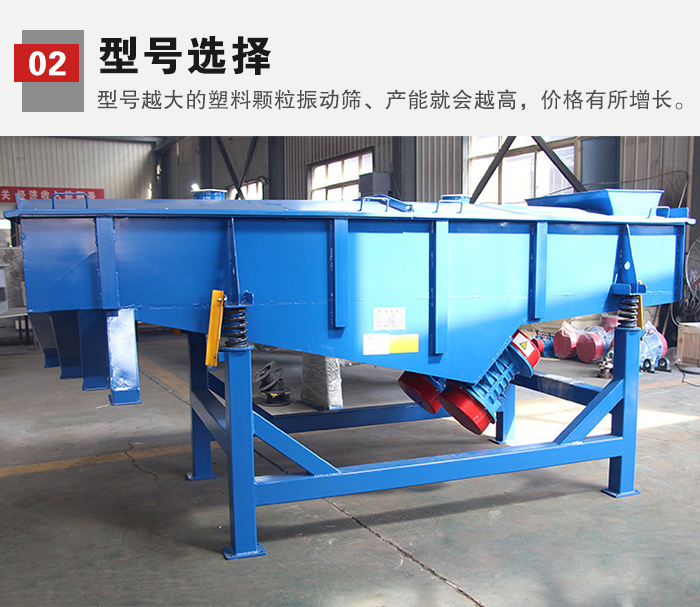 2、型號選擇:各種塑料顆粒振動(dòng)篩型號多樣,型號越大的塑料顆粒振動(dòng)篩、產(chǎn)能就會(huì)越高,相應(yīng)的價(jià)格也會(huì)有所增長。