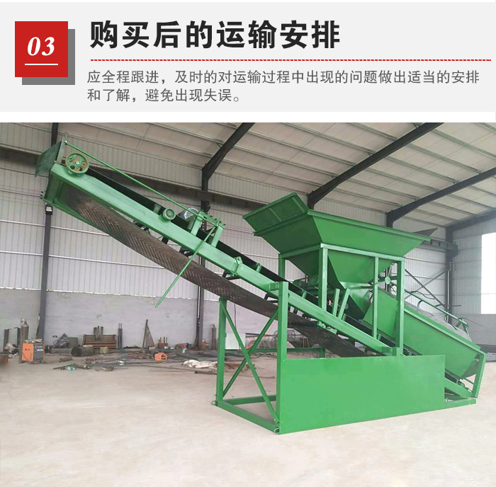 篩沙機(jī)在采購(gòu)?fù)戤吅?,廠家會(huì)在設(shè)備完成后進(jìn)行運(yùn)輸發(fā)貨,此時(shí),用戶應(yīng)全程跟進(jìn),及時(shí)的對(duì)運(yùn)輸過程中出現(xiàn)的問題做出適當(dāng)?shù)陌才藕土私?,避免廠家出現(xiàn)失誤,出現(xiàn)小配件漏發(fā)等問題。